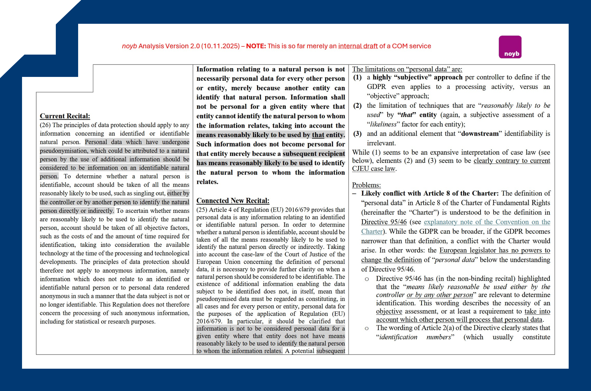 On 10 November 2025, noyb published an analysis of an internal Commission draft suggesting far-reaching amendments to the GDPR via a “Digital Omnibus.”